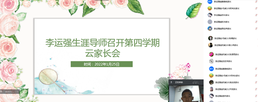 为更好地完成 2021—2022 学年度第四学期课程,进一步深化学院教育教学改革,丰富学生的社会阅历,促进实践育人、劳动育人,增强学生的社会责任感及人文素养,加强家校共建的方针,李运强老师于2022年1月25日召开了第四学期云家长会。