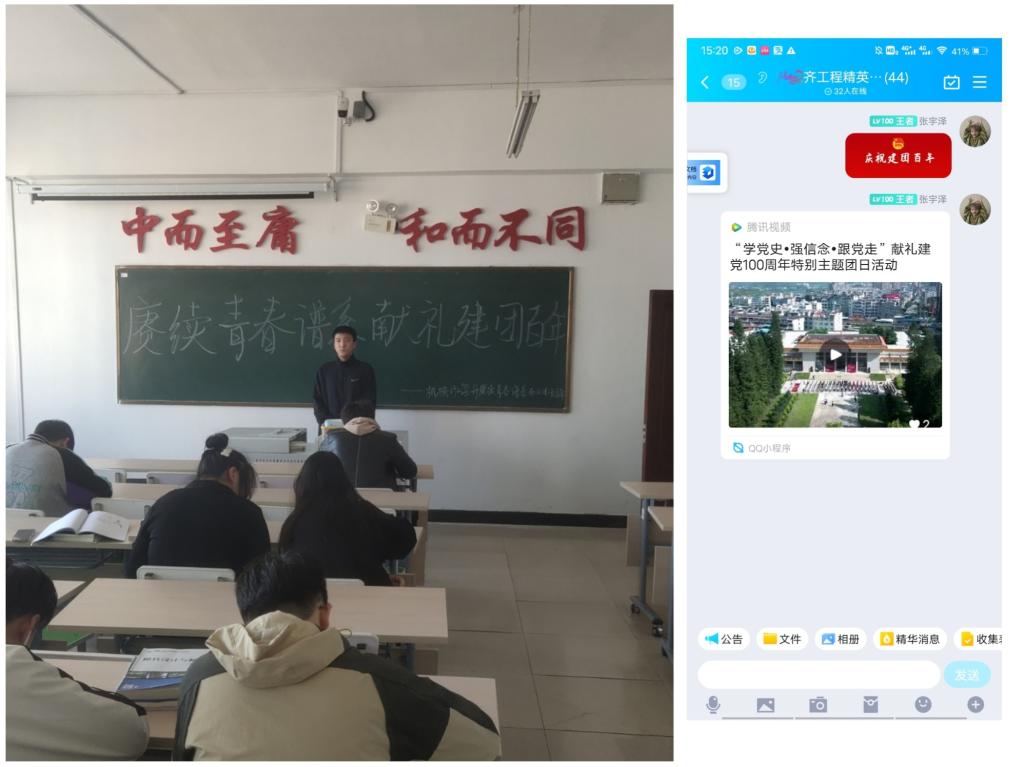 在本次团日活动中,宣传委员张宇泽首先为同学们介绍了团史知识,采用文字与视频结合的方式,生动形象地为大家展示了百年历史的波澜壮阔,随后组织委员王啟带领同学进行团史知识的有奖问答环节,同学们参与的十分积极,该环节取得了很大的成效。最后宣传委员张宇泽告诉同学们:我们作为新时代的青年,应肩负起历史赋予我们的使命,努力学习,积极奋斗,奋发图强,为实现“两个100年的目标”做出贡献,为服务人民做出贡献。本次赓续青春谱系,献礼建团百年主题团日活动。