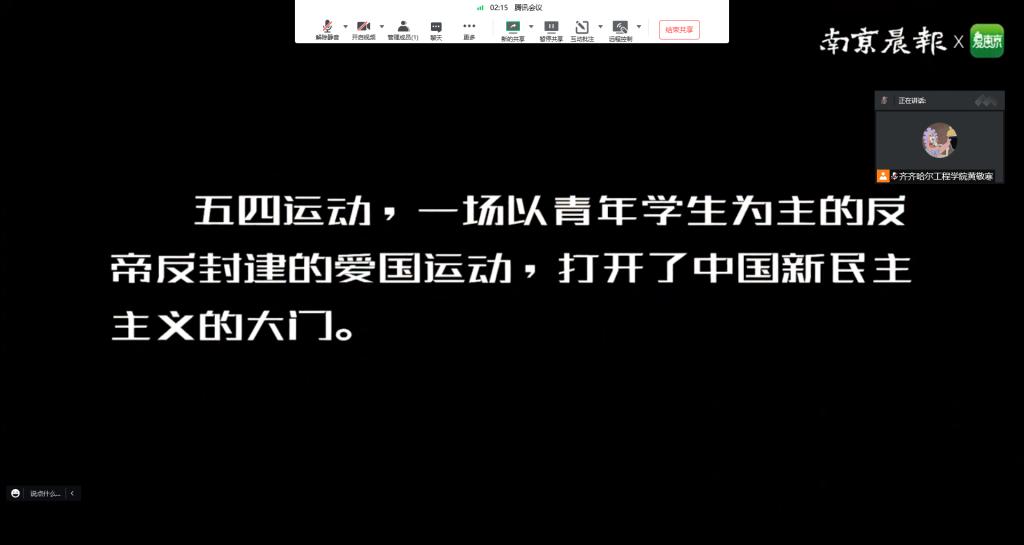 姜宇同学和黄敬寒同学在腾讯会议为同学们讲述了五四运动和黑龙江省党代会的的具体内容和具体安排。姜宇同学通过腾讯会议共享屏幕为同学们分享相关视频,同学们认真观看,团支书黄敬寒同时将文字发到聊天栏中,二人互相配合。随后黄敬寒同学为同学们讲解了视频中的细节,并总结道:“黑龙江省党代会,是我们省进入全面建设社会主义现代化国家、向第二个百年奋斗目标进军新征程的重要时刻召开的一次十分重要的代表大会,是党和人民政治生活中的一件大事。”同学们在聊天栏纷纷表示要积极关注。