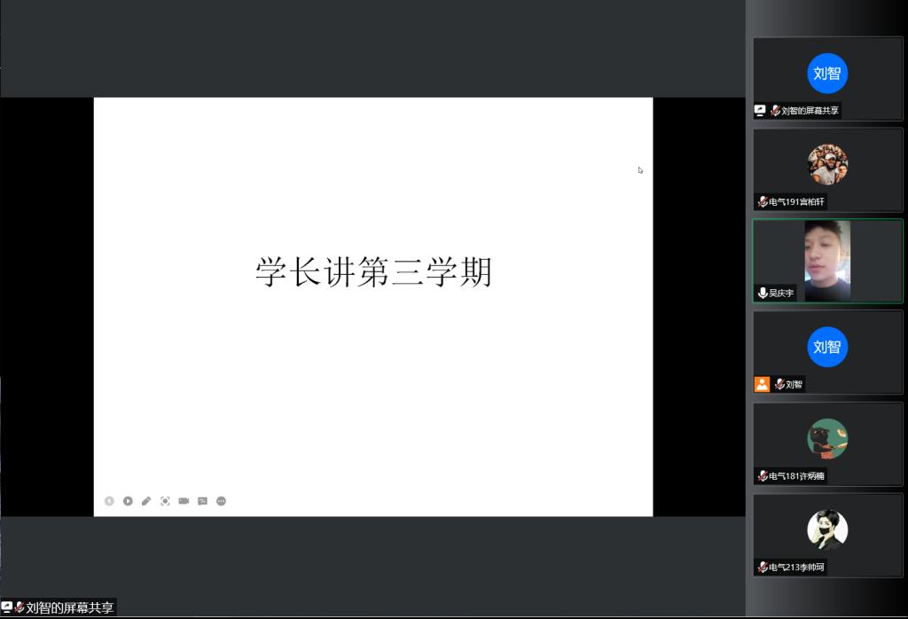 暑假来临,同学们也开始了第三学期的假期实习生活,第三学期是我院的传统,每年暑假,同学们都会前往与专业相关的企业进行实习,为了让同学们更好的理解第三学期的意义所在,电气专业于2022年7月15日以腾讯会议的方式开展学长说座谈会,本次会议由刘智老师主持,主讲人电气181学委吴庆宇,参会人员为电气19-21级全体学生。