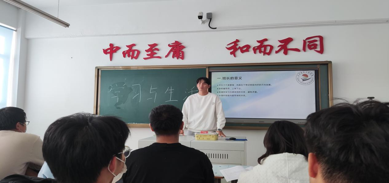 会上,赵桓玉首先与同学们分享了班长的意义,班长是为了更好地服务大家,在于协调,在于协助,营造浓郁的班级氛围,同时表示会以身作则,做好榜样。其次讲解了学校的一些相关规定:如四无校园和德育学分,要求做到严格遵守学校规定:以及在疫情防控的环境下每个人应该如何做好个人防护,大学生如何谨防诈骗。特别强调课堂纪律,进入大学要有足够的自制力和自律性。大学是一个小型社会,与他人交往的过程中要学会人情世故,这有助于同学们的成长。最后是生活,拒绝超支消费,遇到问题要及时沟通,日常多和父母打电话进行交流。