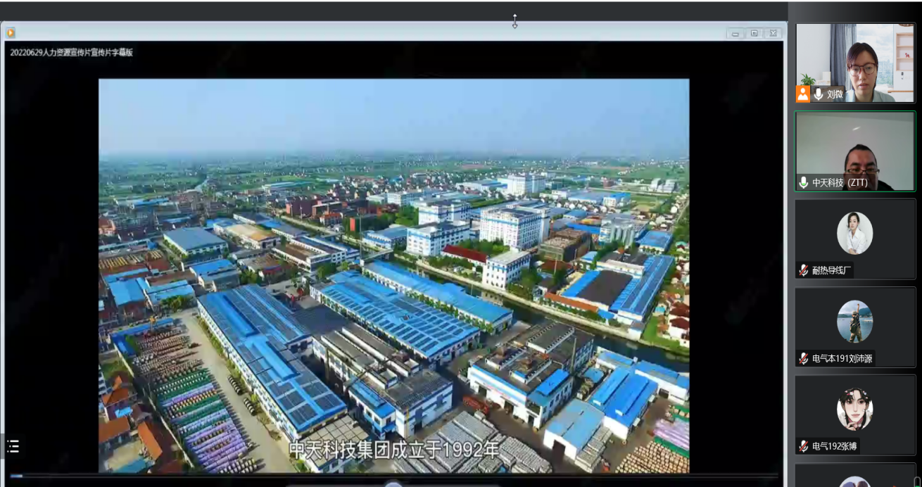 12月7日上午,电气专业携手中天科技进行了一场线上校园招聘会。本次招聘会首先由中天科技康经理向在场同学放映中天科技视频宣传片,展示了中天科技自建立以来,秉持着多元化发展的战略,将集团精心打造为建一流工程、创一流业绩的品牌企业的历程。并且,就中天科技目前所拥有的资质,所获奖项,以及中天科技之前承建的各个项目等企业历史一一向同学们做了详细的介绍。