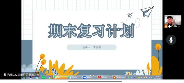 为将至的期末考试作准备,让学生们抓住学期的尾巴,培养学生勤奋刻苦、努力奋斗诚实守信的良好风尚。汽服222班学习委员于2022年12月10日在腾讯会议上开展“期末复习计划”主题线上活动。