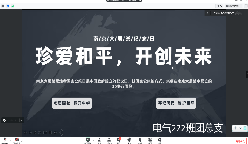 为悼念1937年12月13日南京城内遇难的同胞,铭记历史。电气222班于12月13日开展“珍爱和平,开创未来”主题团课,本次团课由团支书刘昕宇主持。