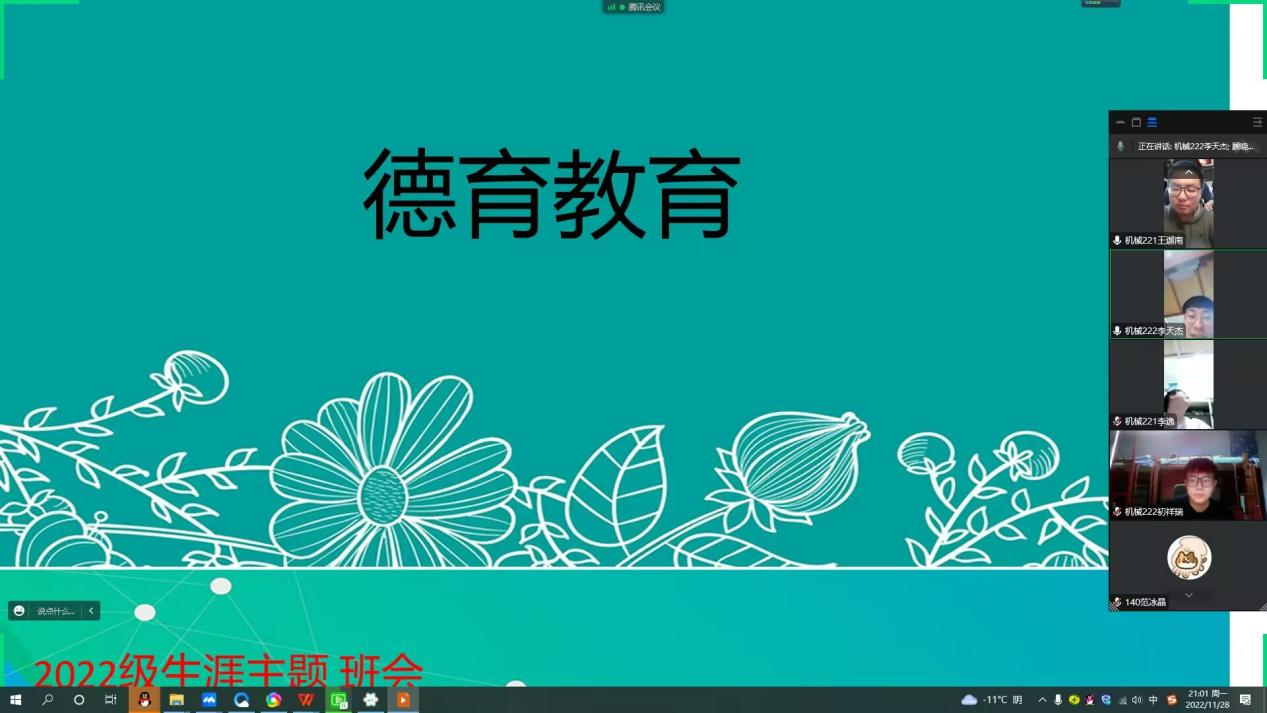 为了让同学们德智体美全面发展,顾晓宇老师于2022年12月29日晚20:00在线上召开了德育教育主题教育班会。此次会议由机电工程系机械教研室顾晓宇老师主持,共10人参加。