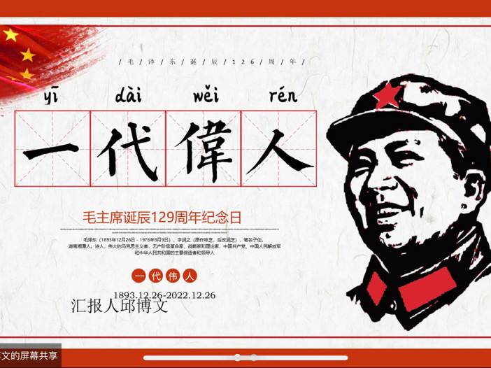 今天是2022年12月26日,是伟大的毛主席诞辰129周年纪念日。为了激发同学们的爱国热情,让大家了毛主席的身世,伟大的事业,机器人222在团支书邱博文的带领下,在腾讯会议展开本次团课。