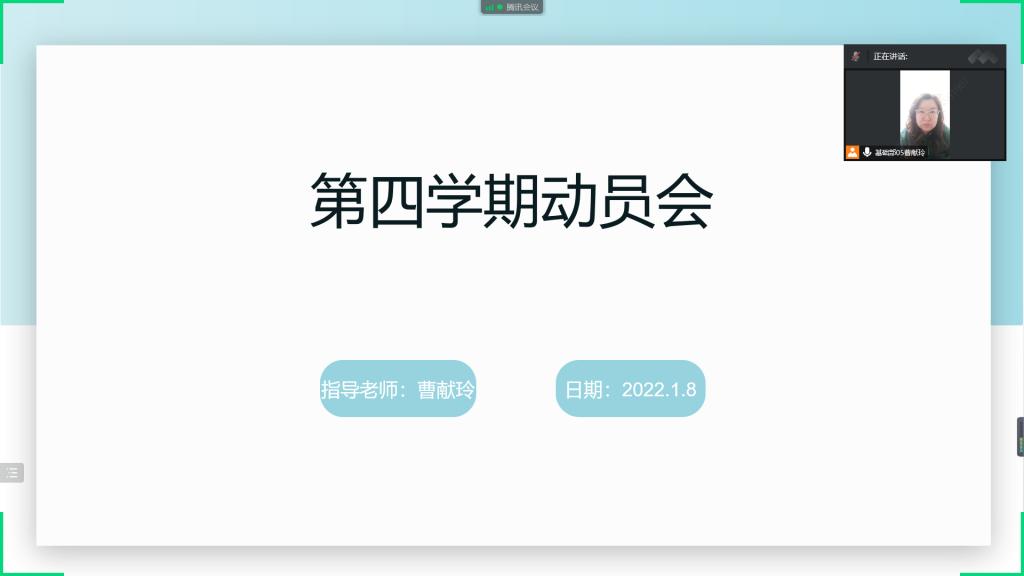 为使同学们明确第四学期任务,促进第四学期高效完成,2023年1月8日19时,第四学期指导教师曹献玲利用腾讯会议召开“第四学期动员会”,所指导组数六组,共21人全员参与。