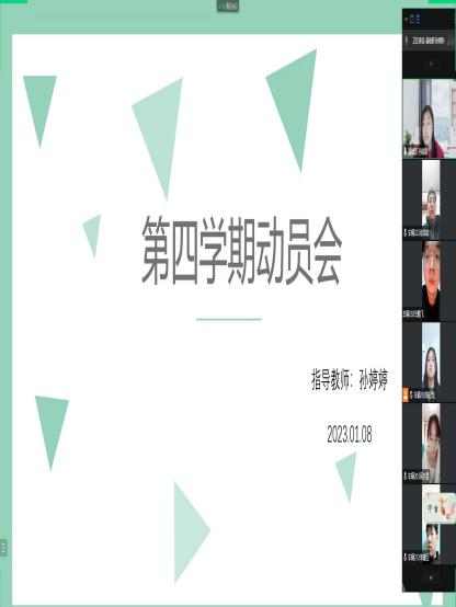 学校为了促进学生的寒假生活,特此开设第四学期来丰富学生们的寒假生活,为了让我们更加深入的了解第四学期的任务以及注意事项,孙婷婷老师于1月8日晚7点,在线上腾讯会议中召开“第四学期动员会”,让同学们能够更加了解第四学期的任务以及注意事项。此次会议由孙婷婷老师带领的学生全员到齐。