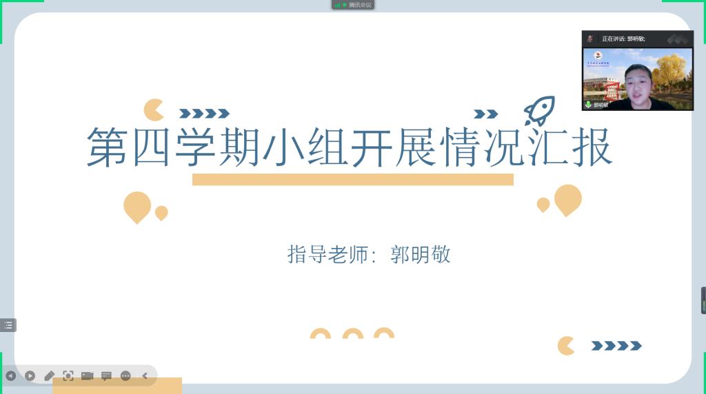 为更好的指导和监督开展第四学期,了解同学们第四学期完成情况,2023年1月12日18时,指导教师郭明敬利用腾讯会议平台开展“第四学期进展情况汇报会”,所指导3组共10人全员参与。