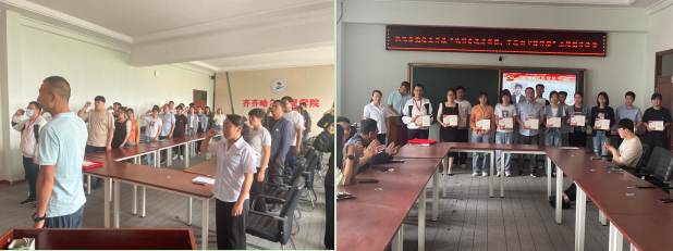 会议第一项,全体党员在机电工程系党总支组织委员郝岩利同志领誓下重温入党誓词;会议第二项,由机电工程系党总支王丽萍书记向每位党员赠送“政治生日”贺卡;