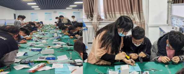 参观实验室后,进行了电路板元件的焊接实践活动,曲老师对同学进行了指导。通过此次实践活动,同学们对电气专业有所了解,学会了电路板焊接知识,为将来的职业生涯打下坚实基础。