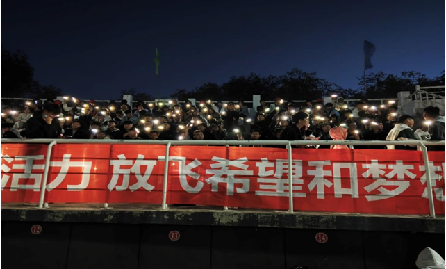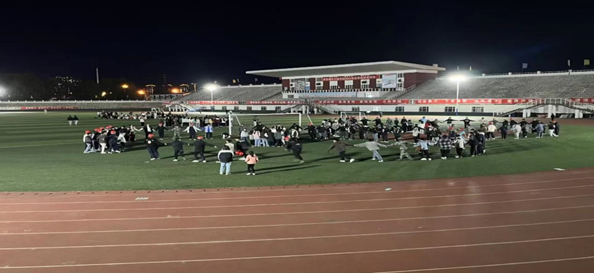 在辅导员肖璐老师及李慧俐学长等的组织下,机械23级学生开始了互动游戏,学生们手拉手,心连心,一时间操场上涌现出许许多多个“同心圆”,伴随李慧俐学长的口令,学生们紧紧拥抱在一起,“团结”二字浮现操场上空。