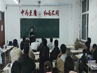 本次团课首先由团支书胥豪杰向同学们介绍了抗战的相关历史:卢沟桥事变、“九一八”事变、南京大屠杀等,回顾了那段艰苦岁月。随后由青工委员候昊杉带领同学们朗诵了《英雄颂》,听抗战歌曲《游击队之歌》等活动。