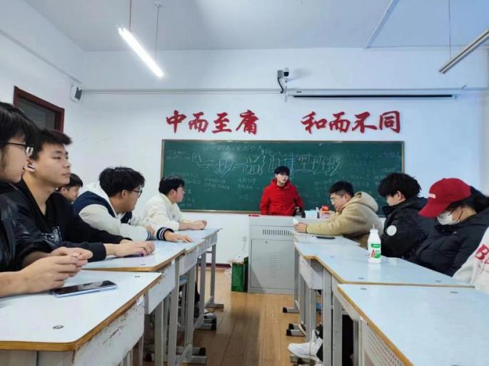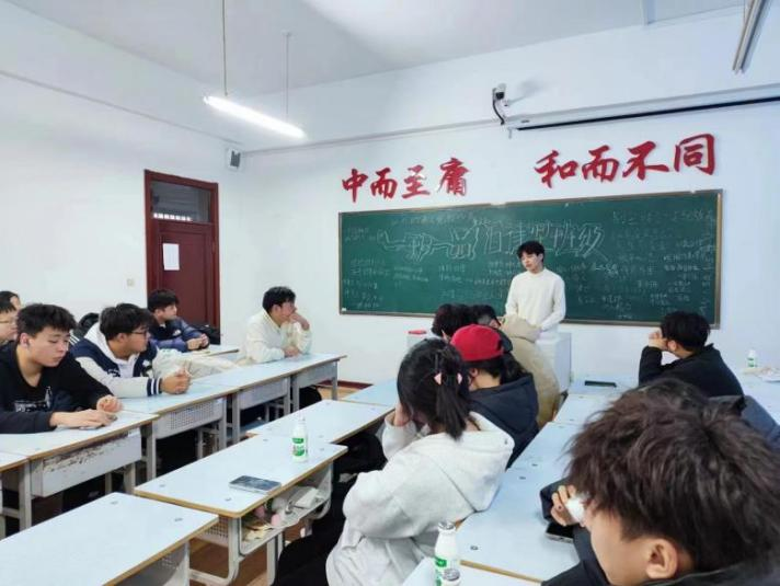 2023年11月24日,为了进一步推进一班一品文化建设,培养学生们的自律意识,提高班级整体素质。机器人222班在团支书邱博文的带领下,在图书馆408召开了“修身养性,慎独慎终”一班一品建设主题活动,其主要目的是为了打造自律型班级,为学生们树立良好的学习态度,找到自己努力的方向,严格要求自己,以自律之习惯培养自身高素质能力。辅导员老师王虹莅临团课现场,进行指导和建议。