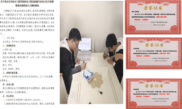 为了增强东方红专班学生的专业实践能力,激发其创新意识,助力校外课堂建设,理实结合,提升一拖专班学生的实践应用能力,11月28日,齐齐哈尔工程学院机电工程系机械专业中国一拖东方红专班开展了首届管理事务流程设计大赛。共12名学生参加,李玲、郝岩利老师作为本次比赛评委,与一拖专班学生们一起利用下班休息时间在线上组织了本次活动。本次竞赛主题为“标准化管理、促效益提升”,旨在考察学生“生产过程及作业分析”知识掌握情况。通过本次竞赛,提升机械设计制造及其自动化专业毕业生的理实结合能力,以及分析问题、解决问题的能力,同时也提高了现场管理能力;本次大赛也促进了一拖生产现场管理事务效率提升,实现产教融合,校企共赢。本次大赛评出一、二、三等奖,并颁发奖状,以资鼓励。