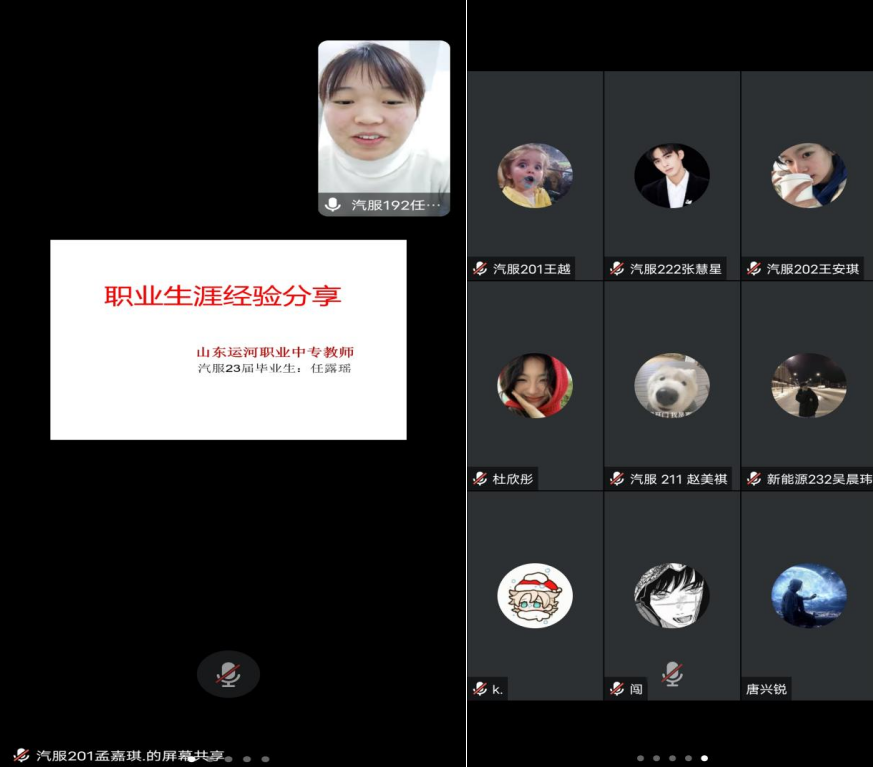 任露瑶是我校2023届毕业生,毕业后进入山东运河职业中专担任汽修专业老师,在职业生涯引导会中,任露瑶谈到她的工作环境、岗位工作职责、且常生活等方面的情况,倾听她在工作中的经历和收获,也了解对岗位的适应情况和对就业的满意度。同时任露瑶表示在齐齐哈尔工程学院学到的知识和技能,为其在后续的工作打好了坚实基础,特别我校培养学生具备的吃苦耐劳、兢兢业业的职业素养,得到任露瑶工作单位领导的高度认可,最后任露瑶教导在校学生奋发进取,爱岗敬业,结合所学专业知识勤实践、多磨砺、善积累,不断提升自身专业能力和职业素养。