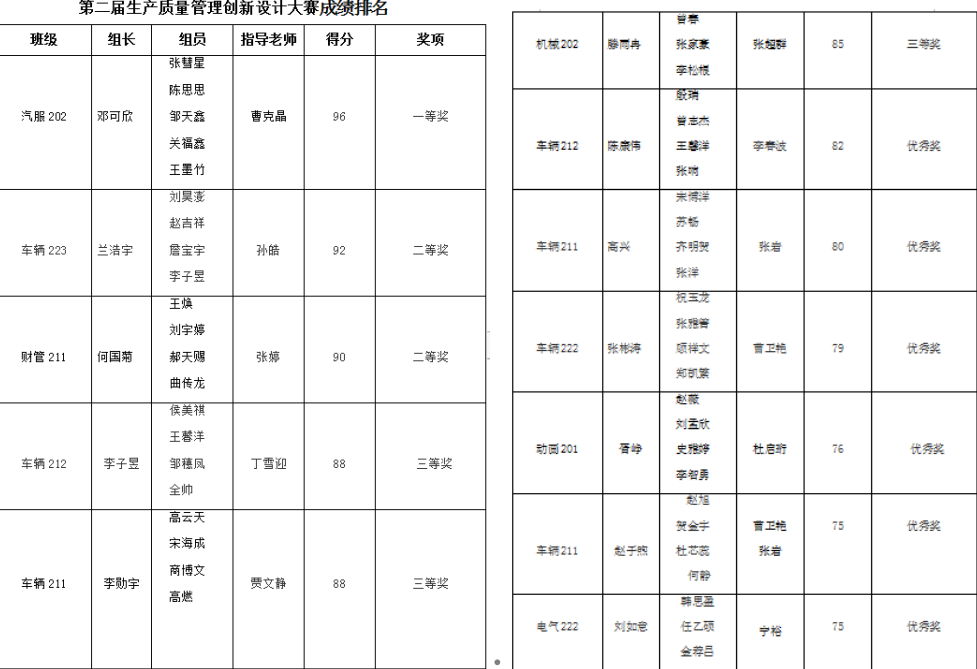 2023年12月22日上午,由齐齐哈尔工程学院教务处、创业学院主办,车辆工程专业承办的第二届生产质量管理创新设计大赛在评审老师的严格筛选下最终确定了获奖名单。