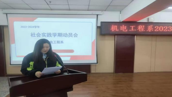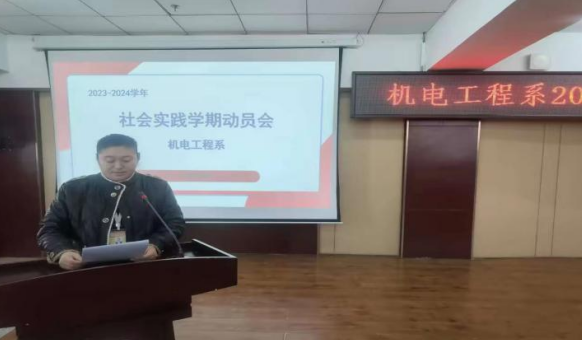 机电工程系党总支副书记郭明敬介绍《机电工程系2023-2024学年度社会实践学期实施方案》。对本次社会实践学期的具体目标、时间规划进行了详细的讲解,并为同学们提供了宝贵的建议。