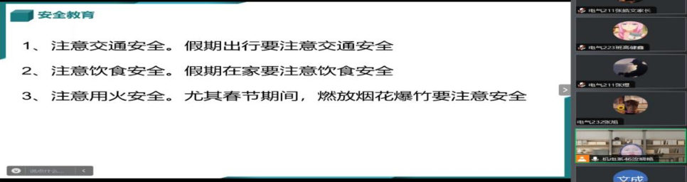 为了进一步加强社会实践学期学生实践意识及安全教育,引导学生认真完成社会实践学期任务,逐步提高学生的安全防范意识。1月6日,汝晓艳老师通过腾讯会议开展社会实践学期云家长会,所指导2023级、2022级、2021级全体生涯学生及部分家长参会。