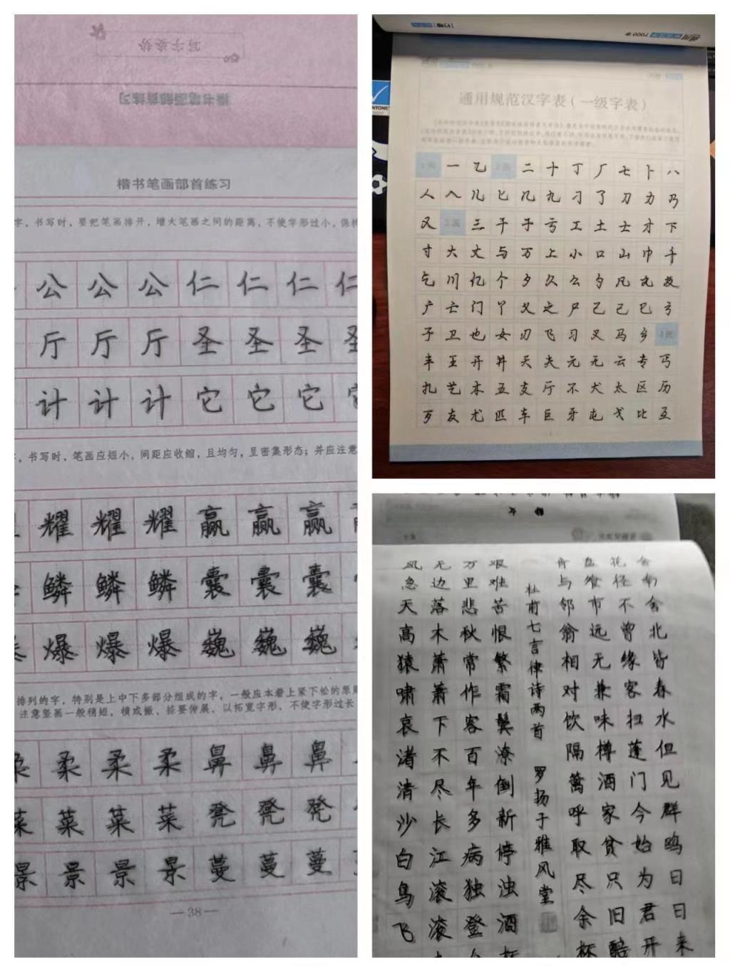 本组的三名成员根据兴趣爱好以及个人的基础选择不同的字帖进行临摹,分别是字的练习、部首的认识和诗句的积累,因每个人的基础不同而有所改变。本组的成员张博宇同学认为字帖临摹可以提高书写的美观性,这在毕业以后的工作中也能起很好的作用。