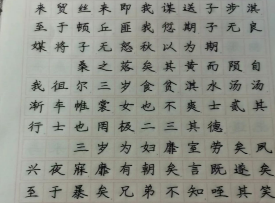 主要临摹有古代《诗经》中的《氓》出自《诗经·国风·卫风》,这是一首弃妇自诉婚姻悲剧的长。诗中的女主人公以无比沉重的口气,回忆了恋爱生活的甜密,以及婚后被丈夫虐待和遗弃的痛苦。体现了女性具有反抗精神,女性独立意识。