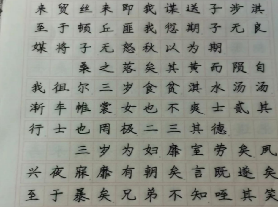 1月9日贵州省遵义市机电系041组在家临摹字帖。主要临摹有古代《诗经》中的《氓》出自《诗经·国风·卫风》,这是一首弃妇自诉婚姻悲剧的诗。诗中的女主人公以无比沉重的口气,回忆了恋爱生活的甜蜜,以及婚后被丈夫虐待和遗弃的痛苦。体现了女性具有反抗精神,女性独立意识。以及战国时期屈原的诗《离骚》。而在离骚的一字一句中,我们可以窥见他的高尚品格和他为振兴楚国所做的事,更能感受到他忧郁苦闷的心情。