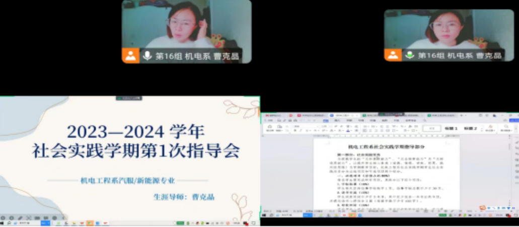 2024年1月10日,曹克晶老师在腾讯会议对全体生涯学生开展了社会实践学期第一次指导会,在本次会议上指导同学们如何完成社会实践学期任务,明确了各项要求。