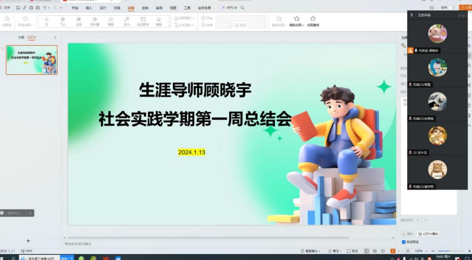 1月13日19:00顾晓宇老师在腾讯会议对全体生涯学生开展了社会实践学期第一次总结会,在本次会议上指导同学们如何完成社会实践学期的各项任务,并且明确了要求。