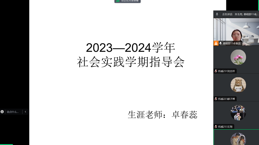 1月11日,生涯导师卓春蕊通过腾讯会议召开了社会实践学期指导会。本次社会实践学期指导会让同学深入了解社会实践的意义,明确实践安排,为实践活动做好充分的准备。