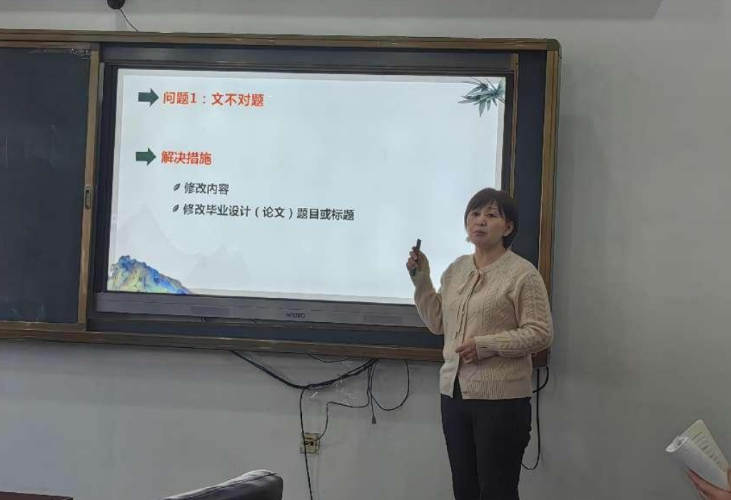 然后杨翠丽老师结合齐齐哈尔工程学院毕业设计要求,对毕业设计(论文)撰写的相关规范进行讲解,她对论文格式提出了具体要求并对其中一些基本格式设置进行解读,分析了典型问题并提出解决措施。