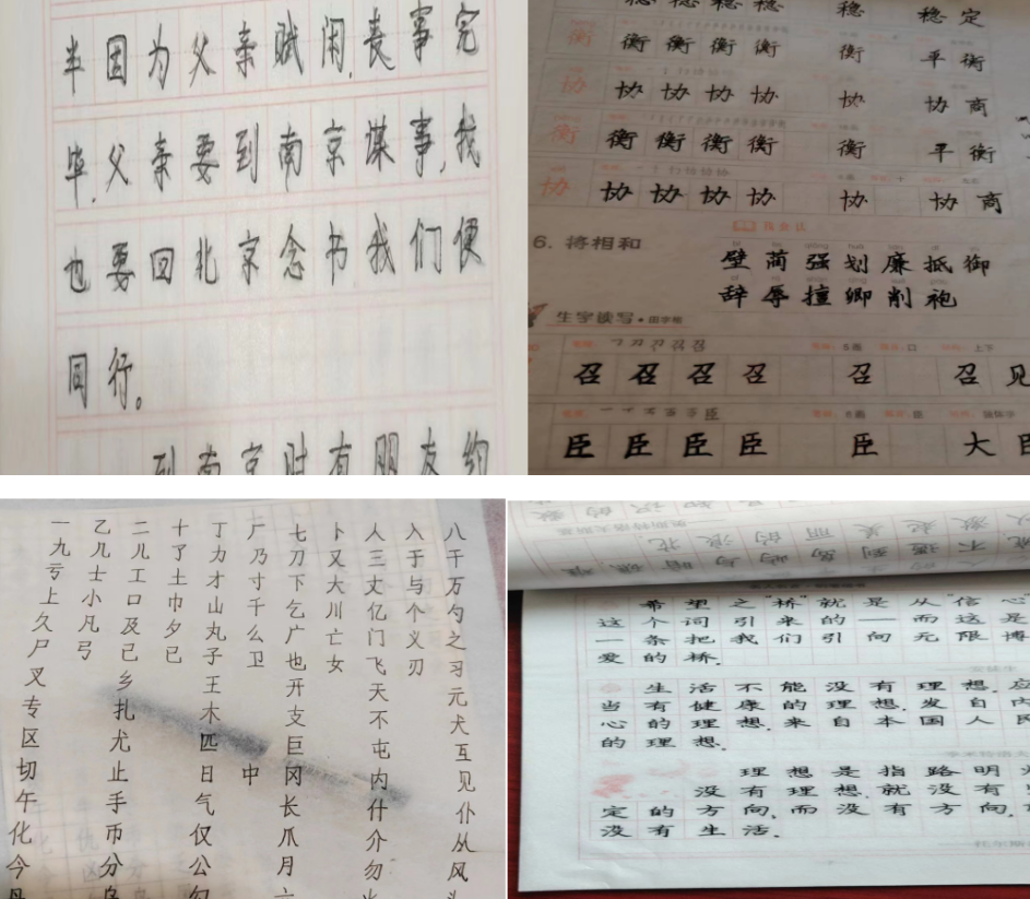 为了保证放假期间学生不放纵自我,保持学习的习惯。社会实践学期开始第一天,jqr2024033组的成员:尚效婕、黄超、张宇晴、谢政逸,在各自家中都自觉进行了字帖临摹。