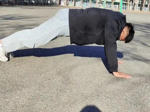 活动过程中,柳光礼选择于室外进行俯卧撑运动。首先,两肘向两侧分开,双臂慢慢伸直。然后在充分伸直手臂之后,停顿一下。最后,缓慢弯曲手臂,降低身体;直至胸腔触地并停顿片刻。适度的锻炼能够促进血液循环、增强免疫力,提高身体各系统的功能。同时也可以锤炼我们的意志力和耐力。