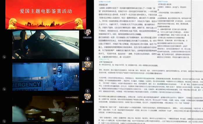 为了响应学校的社会实践学期的号召,机电系cl2024042组车辆212李子昱,车辆212李昀晓,车辆213王志勇,车辆211孙诗萌在完成每天基本任务的同时开展了以爱国教育为主题影视鉴赏活动。