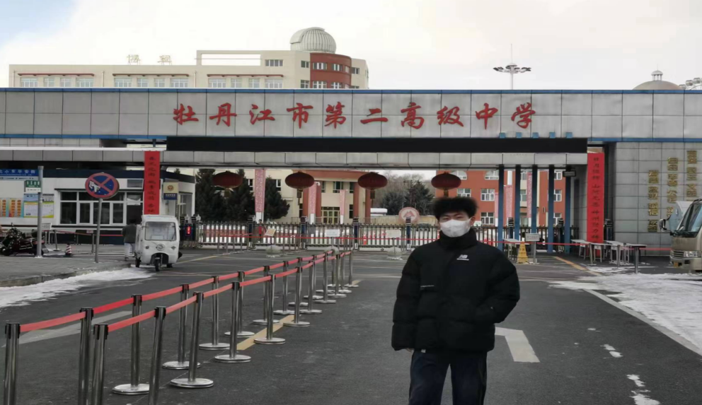 1月20号CL2024090组冯文涛回到自己的母校牡丹江市第二高级中学进行线下的母校回访活动。并在学校门口进行拍照留念。