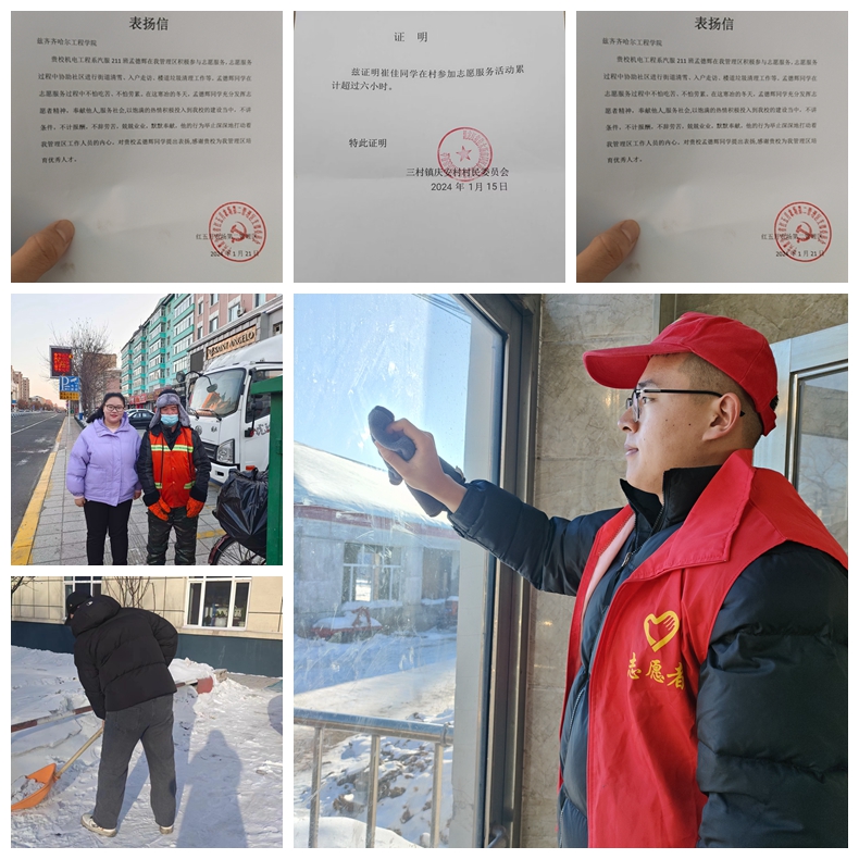 机电工程系第qf2024019组组员提前联系当地社区工作人员,加入志愿者队伍,积极当地社区志愿工作,协助当地社区进行清雪,清扫公共区,入户排查等工作,该小组成员在工作中不怕吃苦,积极发扬,发扬齐工程学子精神。深受当地社区好评,分别获得了当地社区的表扬信和工时证明。