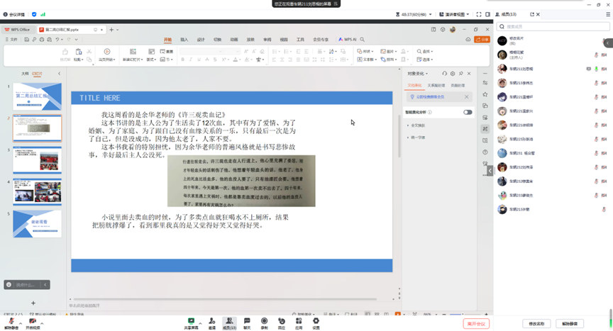 会议开始,王睿老师首先对同学们进行了读书情况的询问。同学们纷纷与大家分享了自己所阅读的书籍以及阅读过程中的感悟。王睿老师对每位同学的阅读成果给予了充分的肯定,并针对同学们在阅读中遇到的问题给予了指导和建议。