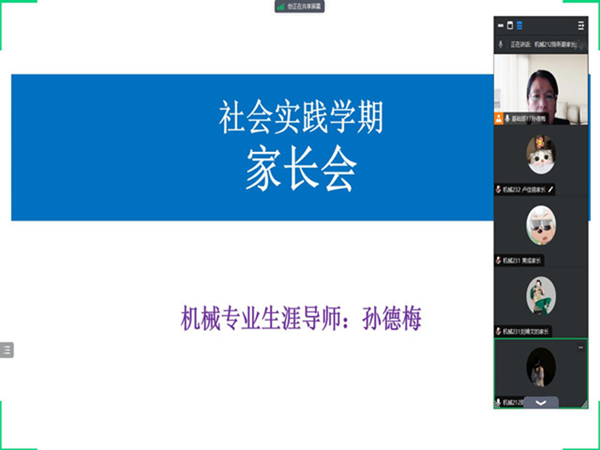为进一步增强家校联动,形成教育合力,1月25日晚,机械专业生涯导师基础部孙德梅组织召开社会实践学期家长会,机械专业21级、22级和23级生涯学生及其家长近50人线上参会。