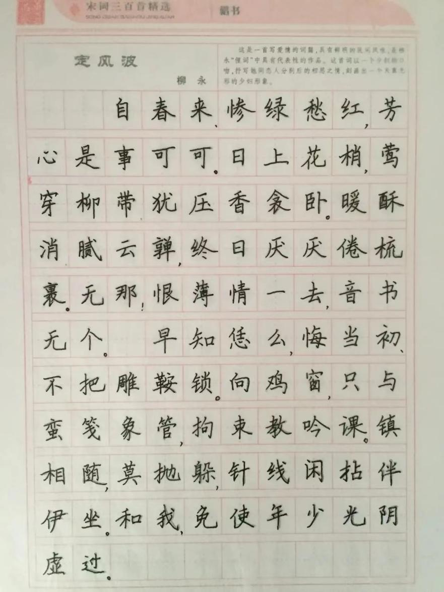 字帖临摹是社会实践学期的一个重要项目,我选择了一本宋词三百首字帖来临摹。通过临摹字帖,学习楷书字体,使字迹更加工整,优美。在临摹字帖的同时,可以学习宋词,体会宋词魅力,了解宋词文化,学习宋词与其他朝代的词不同之处,丰富我们的知识储备。临摹字帖可以让我们拥有好的字迹,好的字迹在任何情况下都会是加分项。