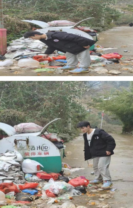 我们联系好了村里的人带着我们的工具帮助社区打扫卫生。我们分工明确有的打扫道路,有的在捡垃圾,有的在收拾垃圾箱旁的垃圾。