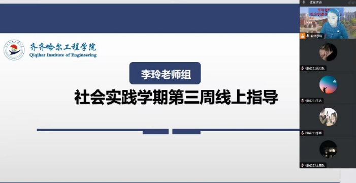 1月28日李玲老师召开了第三周社会实践学期线上指导会议,对本周各组的任务完成情况进行了总结,小组长对本组第三周任务完成情况进行了汇报,把每组存在的问题进行了总结,李玲老师针对各类问题和大家进行了探讨,同学们各抒己见,最后小组长根据问题制定出解决方案和工作计划,通过小组成员共同努力使本小组的得分得到提升,通过这种阶段性的考核,能够及时发现并纠正同学们在任务执行过程中出现的问题,李玲老师对各组组长提出表扬,也对各项任务完成较好的同学给与了肯定和表扬。