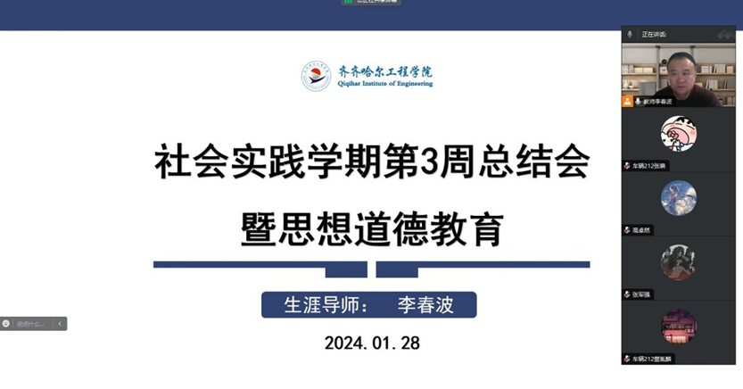 为及时了解学生社会实践学期任务完成情况,对前期工作进行总结梳理,保证后续工作更好的进行,生涯导师李春波老师于1月28日组织所带生涯学生通过腾讯会议召开社会实践学期第3周总结会暨思想道德教育会议。