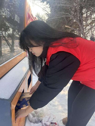 活动中,盖庆洋同学积极帮助社区,清理周边垃圾箱,为社区以及周边居民住所提供一个良好的生活环境,同时也组织大家进行人行道路少量冰块的处理,保障了老年人的安全出行。