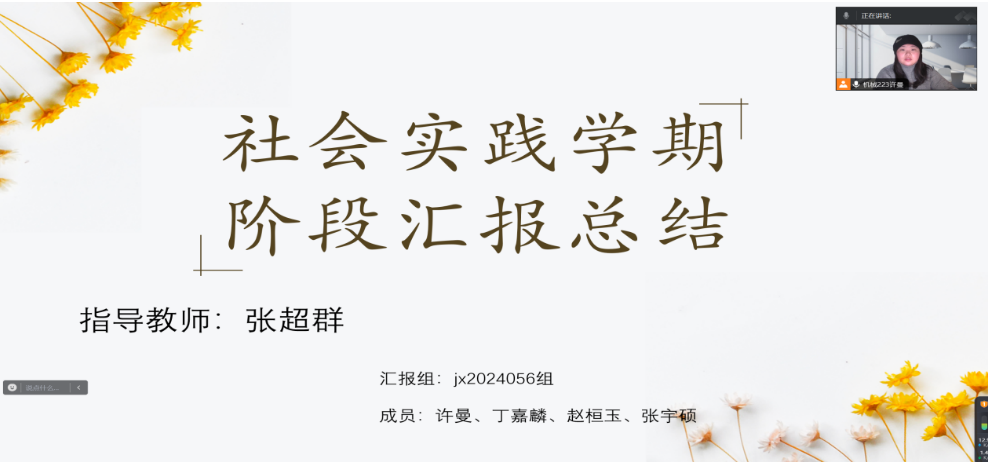 会议开始,首先由张老师对全体学生完成情况进行总结,督促大家按时完成自己上报的主题活动。本周张老师要求学生总结采用文字形式每组上报对应数据,包括字帖临摹、深度阅读、调研报告、志愿服务、母校回访以及可选项目的完成度并及时完成共享表的填写。由组长进行督促完成。接着由jx2024056小组进行汇报实践成果,该小组汇报了前期完成的项目内容,并对后期的实践任务做出安排。在汇报中,该小组字帖临摹和深度阅读完成度较好,志愿服务与母校回访完成度一般,计划将在下周完成调研报告,其余任务均已完成。然后,张老师对职业生涯规划PPT进行指导,张老师建议学生可以从自我探索、职业探索、决策应对和行动计划几个方面入手。最后,本周已经是社会实践学期的第四周,张老师督促大家合理规划时间,按时完成项目任务。春节假期来临,张老师叮嘱学生们假期出行注意安全。