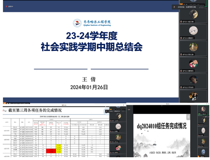 社会实践学期的第三周已经接近尾声,为承上启下,推动社会实践学期dq2024010-dq2024014小组各项学习工作的持续开展,生涯导师王倩于1月26日晚通过腾讯会议主持召开社会实践学期中期总结会,全体生涯学生参会。