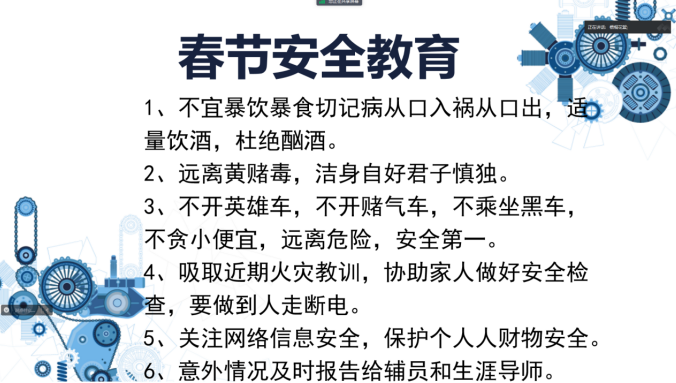 最后,王睿老师对学生进行了春节期间的安全教育。他强调,春节期间,学生们要时刻注意人身安全,遵守交通规则,避免参与危险活动。同时,他还提醒学生们在享受假期的同时,不要忘记学习,要保持良好的作息时间,确保度过一个充实、安全的春节。