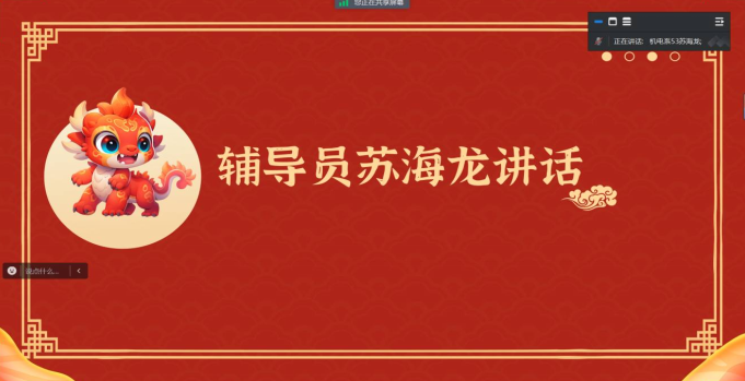 会议第二项,由机电工程系辅导员苏海龙老师讲话,苏海龙老师首先说明了这是学生的最后一个假期,在假期中希望家长可以督促孩子按时完成专业长下发的任务,加强家校之间的沟通与合作,建议家长积极与孩子保持良好的沟通,关注孩子的成长和发展,规划好孩子们的就业情况,协助老师让孩子养成良好的习惯。