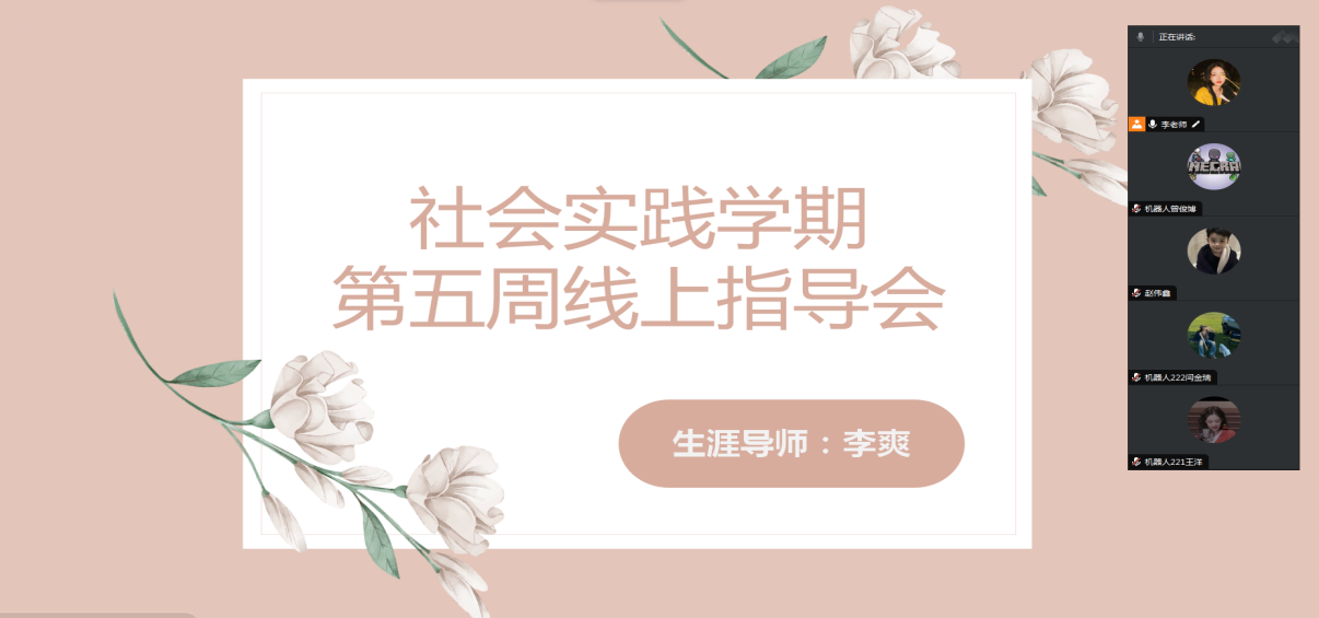 2月6日生涯导师李爽召集生涯学生开展了社会实践学期第五周总结会,此次会议总结了前四周的实践成果同时为接下来的实践做出明确的指导。