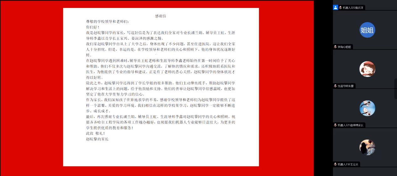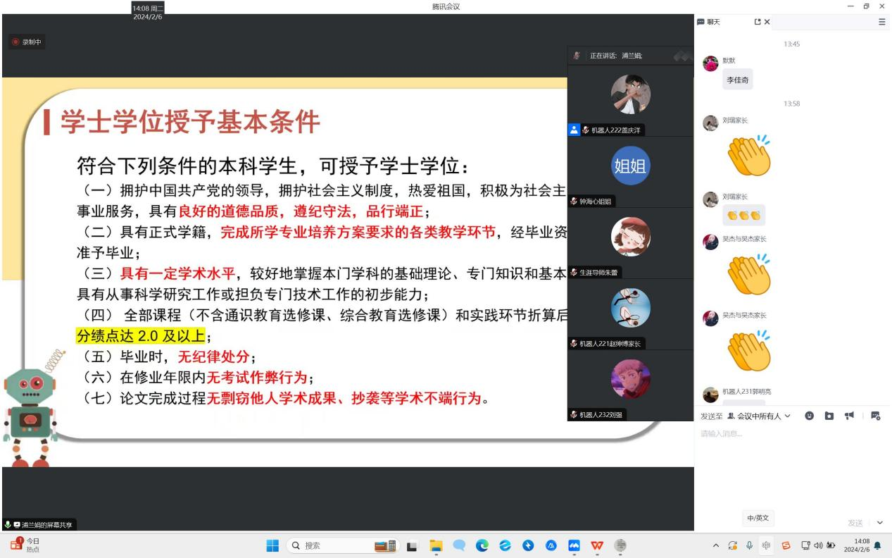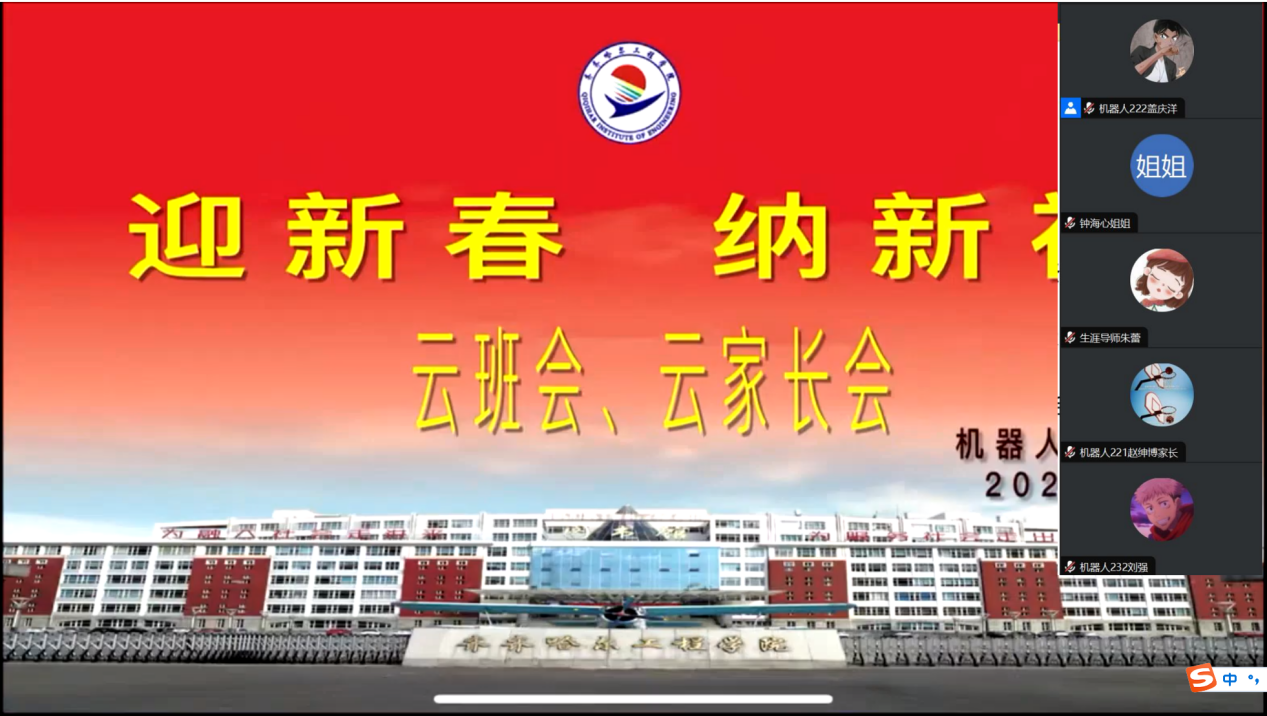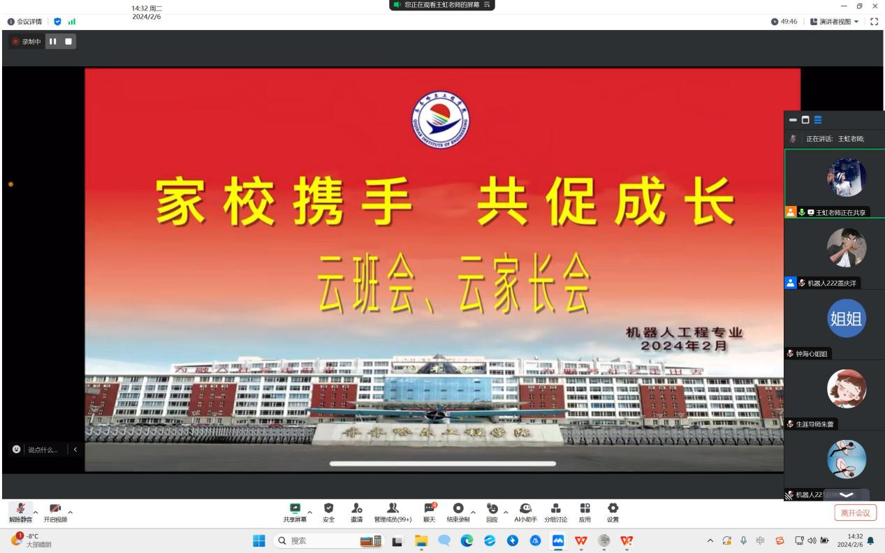 2024年2月6日机器人工程专业在线上召开了“家校携手,共促成长”云家长会、云班会。其目的是为了加强家校共育,促进家校共同合作,并确保社会实践学期活动的顺利完成。机电工程系党总支副书记郭明敬,机器人工程专业专业长、辅导员、生涯老师、家长及学生出席本次会议。