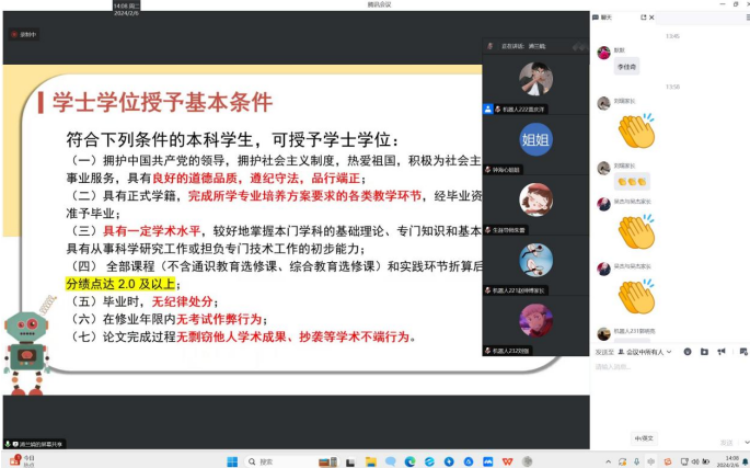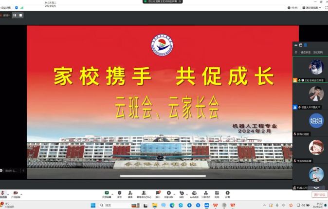 2024年2月6日机器人工程专业在线上召开了“家校携手,共促成长”云家长会、云班会。其目的是为了加强家校共育,促进家校共同合作,并确保社会实践学期活动的顺利完成。机电工程系党总支副书记郭明敬,机器人工程专业专业长、辅导员、生涯老师、家长及学生出席本次会议。