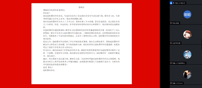 两位家长代表也对于学校对学生们的关心做出感谢讲话,柯皓轩家长表示:“孩子从南方来到东北,锻炼了自己的意志,提高了人格,感谢学校所有老师的付出。”赵皖擎家长更是给学校书写了一封感动的感谢信来表达自己对学校领导及老师对孩子的关心,感谢各位老师在学生生病时的悉心照料。这也是家校共育的成功之处。